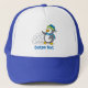 A little penguin cartoon waving in front of a snowball stack. Custom text.