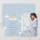A soft and heavenly baby shower invitation featuring a sweet sleeping angel baby nestled among fluffy clouds, crescent moon, and delicate stars. Designed in gentle pastel blue with subtle gold accents, this celestial invitation creates a dreamy and heartfelt atmosphere—perfect for celebrating a truly heaven-sent baby girl. A timeless and graceful choice for a memorable baby shower celebration.