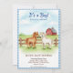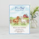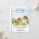 • An adorable watercolor design featuring two sweet little ponies standing in a grassy field in front of a rustic wooden fence and classic red barn. This delightful set is framed by a blue gingham border, perfect for a country farm-themed baby shower.