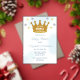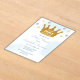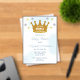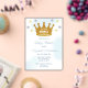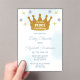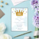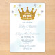 A little prince is on the way! Boy baby shower with gold crown and silver and gold stars with dreamy blue watercolor background