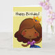 A customizable birthday card featuring a happy cartoon Princess with rosey cheeks and deep brown hair dances in a fancy purple dress with dark blue accents.