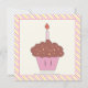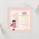 Little princess and cupcake girls 1st birthday party pink yellow kids invitations, featuring a little adorable dark hair brunette princess holding a cupcake, the number 1 patterned with pink, yellow diagonal stripes and a crown. There is a pink, yellow striped border around it. On the back there is a cute cupcake. Colour scheme: pink, yellow, brown, peach. Some art elements by Trina Clark.