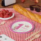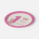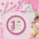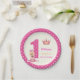 Pink white little princess and crown polka dot pattern border girls 1st birthday paper plate design, including a charming princess holding a frozen treat ice cream cone, a border of hot pink and white polka dot pattern, the number one 1 patterned with pink dots on white and a crown with a peach heart. Ideal for a little girl’s first birthday festivity party. Shading plan: pink, white, peach. Some art components by Trina Clark.