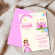 the front design shows a birthday invitation for kid's in pink along with little princess, castle, rainbow,balloons,birthday cap and birthday gifts in the background. the design is extremely cute and colourful and will be ideal for your little princess.