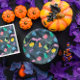 Halloween party table decoration. Design with fun Halloween characters. Funny little pumpkins, funny ghosts, mischievous kittens and bats. See the entire collection. Ideal for children's fall parties.