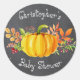 Little Pumpkin Baby Shower Sticker with chalkboard background. For further customisation, please click the "Customise it" button and use our design tool to modify this template.