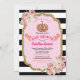 Cute little pumpkin theme baby shower invitation with pink and gold glitter, and chic black and white stripes.