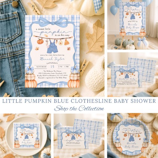 Celebrate the upcoming arrival of a little boy with this charming pumpkin baby shower invitation. Featuring a sweet blue plaid background, watercolor pumpkins, and an adorable baby clothesline design, this fall-themed baby shower invite is perfect for an autumn celebration. The elegant script font paired with rustic details makes it ideal for honouring a mum-to-be in style.