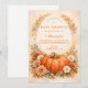A warm and cozy fall baby shower design featuring a hand-painted watercolor pumpkin surrounded by soft peach florals, golden leaves, and delicate autumn accents. The earthy orange palette and elegant arch layout create a refined harvest aesthetic that feels timeless and inviting. Perfect for an autumn celebration, a neutral fall theme, or a charming “Little Pumpkin” baby shower with rustic floral details.