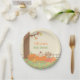 Baby shower party plates with a fall theme perfect for baby showers held in the autumn period. Design has a cute little baby peeking out among all the pumpkins in the pumpkin patch yard with pumpkins and autumn leaves lying around. Fall colours of oranges, browns, reds and yellows. Personalise with message.