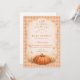 A warm and cozy fall baby shower design featuring a hand-painted watercolor pumpkin surrounded by soft peach florals, golden leaves, and delicate autumn accents. The earthy orange palette and elegant arch layout create a refined harvest aesthetic that feels timeless and inviting. Perfect for an autumn celebration, a neutral fall theme, or a charming “Little Pumpkin” baby shower with rustic floral details.