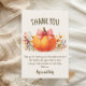 Express your heartfelt gratitude with this adorable Little Pumpkin baby shower thank-you card. Featuring a watercolor pumpkin topped with a pink bow, surrounded by soft fall florals, and a sweet message from the parents-to-be, this card is perfect for sending appreciation after your autumn celebration. Personalise the names to create a meaningful keepsake your guests will treasure.