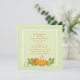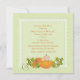This sweet invitation is perfect for an autumn baby shower or any time of year. The square design has a delicate damask pattern and is overlaid with a white scalloped gauze panel. A pumpkin, resting on its vines, has been carved out to make room for an adorable little baby to sit in. The celery green colouring is suitable for either gender.