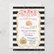 Little Pumpkin is ONE! Gold Pink- First Birthday Invitation with black and white striped background sprinkled with pink and gold confetti. Pink watercolor flowers decorated the beautiful gold frame.