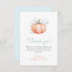 This elegant and charming baby shower thank you card features a beautiful watercolor illustration of a pumpkin with a delicate blue ribbon, perfect for celebrating the upcoming arrival of a little one in the fall season.