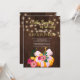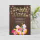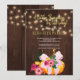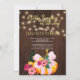 Autumn fall baby girl shower brown barn wood invitation featuring an orange pumpkin with a blue teal bow, a red and hunter green flowers bouquet, strings of twinkle lights and a gold chic typography script.