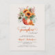 This cute baby shower invitation features a watercolor pumpkin overflowing with fall flowers and foliage, including sunflowers, above the words "a little pumpkin is on the way." The word "pumpkin" is in burnt orange handwriting script decorated with curlicues in imitation of pumpkin vines. Personalise the text with the name of the mum-to-be in burnt orange script and the details in charcoal grey sans serif font on a beige background. Ideal for a gender-neutral fall baby shower.