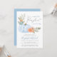 A cute and pretty baby boy couples shower invitation featuring "a sweet little pumpkin is on his way" written in a mixture of blue typography and a stylish soft grey script with a heart swash, and a watercolor bouquet of a pastel blue pumpkin, orange florals and greenery. Personalise the names of the mum and dad in a modern blue script and the shower details in simple soft grey typography.