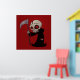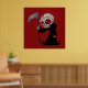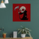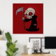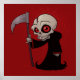 Vector cartoon illustration of a little Grim Reaper with red eyes holding a scythe.