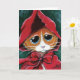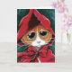 Fun all occasions greeting card featuring a twist on the children's fairy tale. If Little Red Riding Hood was a cat she'd be a ginger tabby. Whimsical illustration of an orange tabby cat wearing a red hooded cloak. Created from an original painting © Lisa Marie Robinson. All rights reserved.