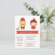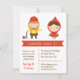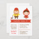 Throw a party based on the familiar kids fairy tale of the little red riding hood! This cute birthday party invitation has the characters of the story with cute little red riding hood carrying a tiny basket and the woodcutter dressed in yellow long sleeves tees, brown pants and boots with an axe in his hand. The reverse page has the big bad wolf or rather a cute nice wolf that is holding on to an apple. Personalise easily with your party details.