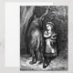 This design features an illustration from the classic children's fairy tale "Little Red Riding Hood". The two best known versions of the fairy tale were written by Charles Perrault and the Brothers Grimm. This classic illustration was drawn by the famous French artist Gustave Doré (1832–1883), who illustrated many books for both adults and children. In this scene, Alice and the wolf are facing in opposite directions, but she is staring directly in the wolf's eyes, unafraid of the wild animal. She is a courageous and confident girl. Alice is wearing a traditional long dress. The wolf's long tail and long legs can be seen clearly, and the creature's ears are pricked up.