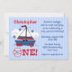 Cute 1st birthday invitation featuring a little sailboat with a smiling face, big red anchor and cute crab. Life preserver is the "O" in ONE. Rope stripe background. Personalise it with customisable text. PinkInkArt original!