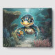 Little sea turtle exploring with her friend. Her big, bright eyes are full of curiosity and expressiveness, making her super adorable. Her head is bright yellow and round, giving her a cheerful and warm face. With a loving smile, she swims directly towards the viewer. The whole thing seems like a happy, magical underwater world full of friendship and adventure.