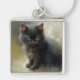 This painting features an adorable black kitten with soft, fluffy fur. She sits in a serene pose, as if calculating her next move. Her green eyes sparkle with curiosity as she studies her surroundings. The background of the painting is a soft, muted grey mixed with yellow/green, which helps to emphasize her dark coat. The overall effect is one of innocence, playfulness, and charm, making it a sweet addition to any room.