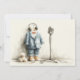 Let your baby boy take centre stage for his big day! This artistic hand-drawn invitation captures the charm of a mini performer with a sketched three-piece suit on a mannequin, a colourized retro microphone, and whimsical music notes drifting in the background.