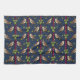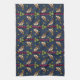 The original pattern on this Kitchen Towel is an original illustration by ZoeSPEAK of little song birds. The birds are facing each other, as if they are singing to each other, against a deep marine blue background dotted with tiny yellow stars. There are vertical rows of twirled red ribbons, with groups of green leaves between the little brown birds.