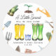 "Little Sprout" Mum dad and blue baby rubber boots rain boots illustration at centre with gardening tools all around