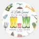 "Little Sprout" Mum dad and red baby rubber boots rain boots illustration at centre with gardening tools all around