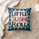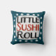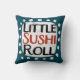 A cute typographic food design that says "Little Sushi Roll". It's black and red text on a white rectangle with funky, playful white dots surrounding it, all on a teal background.