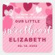 Little Sweet Heart Pink Birthday Thank You Custom Square Sticker. Custom name Valentine's day first birthday party, with pastel pink background and pink, white, magenta and burgundy hearts. easy to personalise template, for one year old baby girl's 1st birthday.