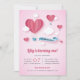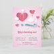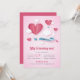 Celebrate your little sweetheart's birthday with these adorable pink heart invitations. Perfect for first birthdays or Valentine's Day birthdays, these sweet pink cards feature heart shaped hot air balloons floating in the clouds, with one balloon trailing a light blue banner that can be customised (shown with "our little sweetheart"). Personalise with your party details beneath.