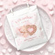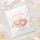 A little sweetheart is on the way! Cute baby bear themed favour bags in soft pink and beige. Featuring an adorable baby bear girl holding a sweet heart shaped cookie, little hearts and clouds. Just perfect for your February girl baby shower around the Valentines day. Easily personalise the text. - Kate Eden Art