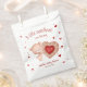 A little sweetheart is on the way! Cute baby bear themed favour bags in red and beige. Featuring an adorable baby bear holding a sweet heart shaped cookie, little hearts around. Just perfect for your February gender neutral or baby boy baby shower around the Valentines day. Easily personalise the text. - Kate Eden Art