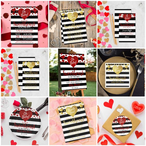 Celebrate in style with these super trendy gold foil love hearts "little sweetheart" baby shower acrylic invitations. The design features a modern black and white striped background with gold foil effect love hearts and matching typography wording. Perfect for anyone having a baby shower on or around Valentin's day. Matching items can be found in the collection.