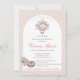 Fall & Thanksgiving Baby Shower Invitation for a baby girl. Features a cute hand-drawn baby girl turkey and pie on an adorable gingham background. Back is printed with a scattered gingham feathers pattern.