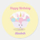 Stickers with a smiling, unicorn-style cupcake. The cupcake has a gold (non-foil) horn and decorative, pastel frosting. The design includes the words “Happy Birthday” and a name. All the words can be customised.