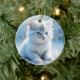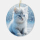 Personalised Christmas ornament. Adorable fluffy white kitten with blue eyes playing outside on a winter day in the snow. Ai generated art.