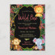 Cute, jungle themed with jungle animals in black, gold, green and rose pink watercolor tropical leaves border with a cute lion, monkey, and an elephant. Perfect theme for having a baby girl. Templates created for you to use including the return address on the back.