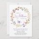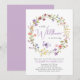 An elegant baby girl shower invitation featuring "a little wildflower is on her way" written in a mixture of modern soft grey typography and a stylish lavender purple script, and boho-inspired watercolors of a wreath of purple, pink, peach and yellow wildflowers and a purple butterfly. Personalise the mother's name and shower details in simple lavender and grey typography.