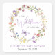 Elegant baby girl shower sticker for your invitations, party favours and thank you cards featuring "a little wildflower is on her way" written in modern soft grey typography and a stylish lavender script, and a boho-inspired watercolor wreath of purple, pink, peach and yellow wildflowers with a purple butterfly. Personalise the mother's name and shower date in simple lavender and grey typography.