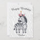 A birthday card for anyone who loves, or are fascinated with, Zebras. Especially for a child -- as the message on the back also emphasizes. The design features a cute caricature of a small Zebra wearing a party hat and set on a background of simulated Zebra stripes. When you select “Personalize this design” you will be offered options to easily change the text (wording, plus type font, color, size, position) and to possibly edit the design elements with changes you may want to make. You may want to scroll down to the section "Transfer design to a product" for a few suggestions about other card styles this design can be used on.