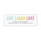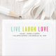 Colourful "Live, laugh, love" in a bold font with name and address details below