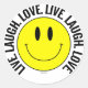 "Live. Laugh. Love." Yellow Smilie Round Glossy Sticker. Designed by SMILIEWEAR™.