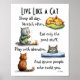 Humourous cat poster with hints on how to live your life like a cat. Cute cat cartoon style illustrations. This is a quote I created and try to live by as much as possible. Great gift for a cat lady or cat guy. AI assisted graphic purchased with commercial license. Artwork: PaintPixelCo