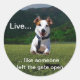 A sheet of inspiring round stickers featuring a beautiful, vibrant photo of a dog bounding through a field, with an expression of pure joy and freedom, and the phrase: "Live like someone left the gate open."